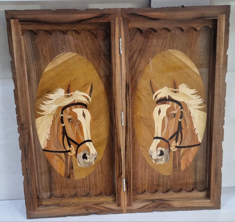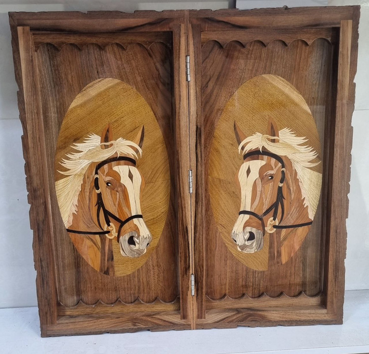 معرق کاری سردیس اسب ، سه لولا مخفی ، کلاف دور از دروازه کهنه روستا استفاده شده ، منبت کاری طرح گل ،