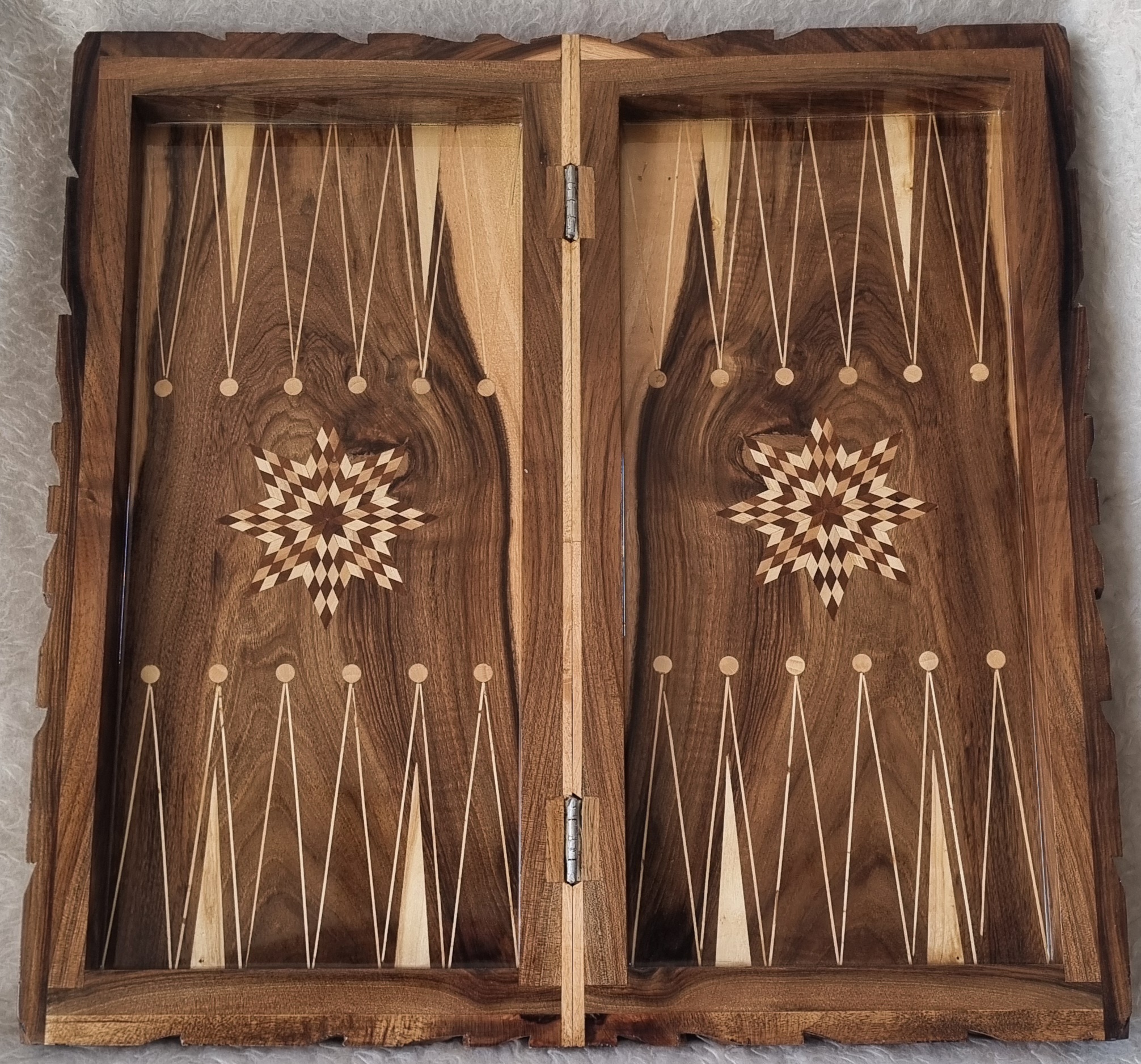 ساخته شده از ریشه گردو: استفاده از چوب گردو در ساخت تخته نرد، موجب ایجاد استحکام و دوام بالا میشود و زیبایی طبیعی چوب در هر قطعه به وضوح دیده میشود.