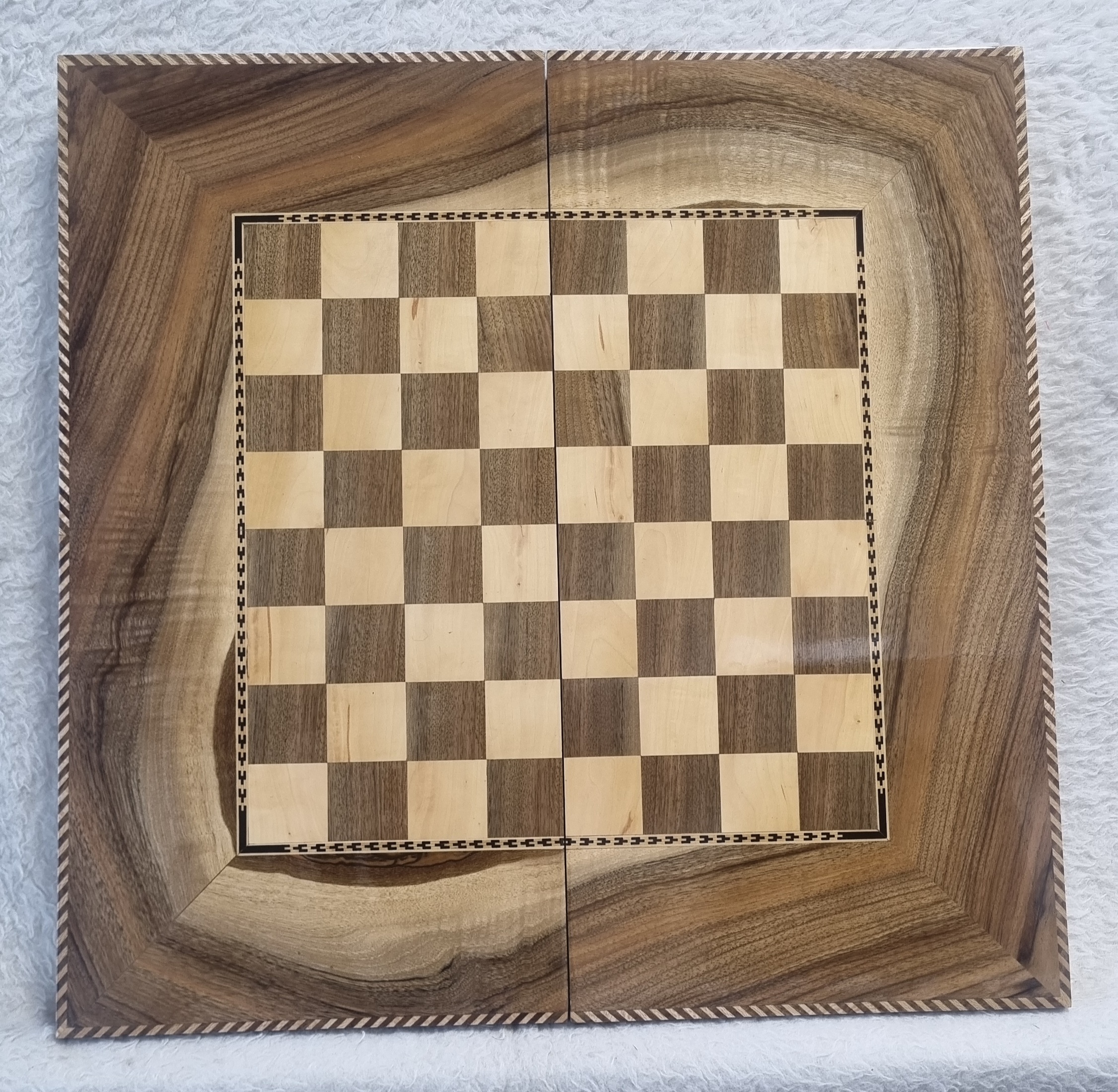 سه لولا مخفی، تمام کار دست ، چوب گردو ، کلاف دور از دروازه کهنه روستا استفاده شده، دارای حاشیه کاری زیبا در دور صفحه شطرنج و لبه ی بیرونی تخته نرد